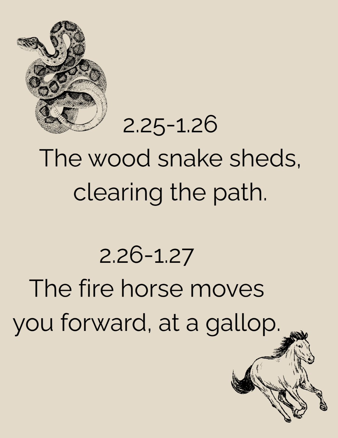 The final shedding of the snake is the hardest- it needs friction to get the last bit off. We'll look at the friction of the last 6 weeks, clear out the fuck no's, transmute any stuck energy and get clear on intentions and identity for the year of the fire horse. Cuz this shit is about to get real fast.